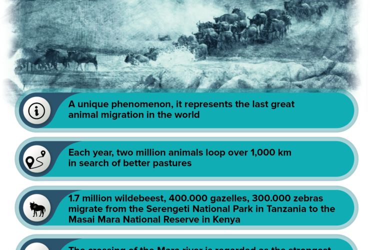 The great migration sees two million animals make a loop of more than 3,000 km each year in search of better pastures. 1.7 million wildebeest, 400,000 gazelles, 300,000 zebras migrate ...
