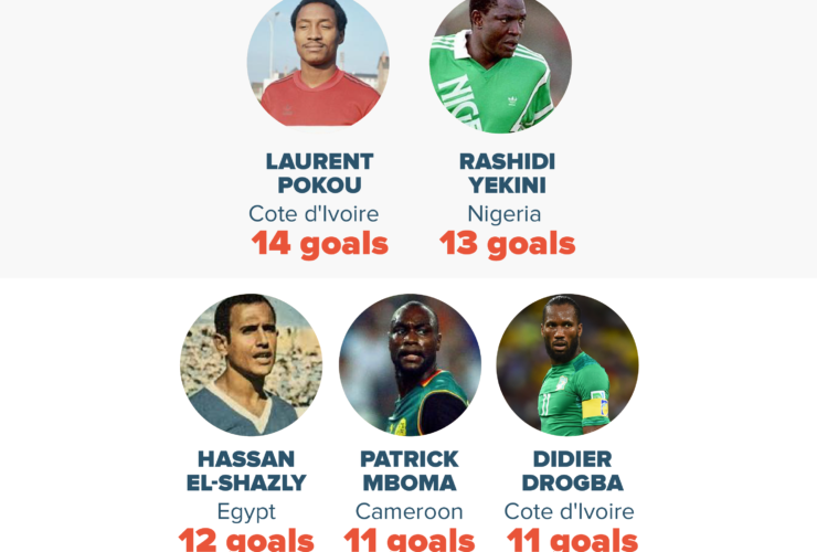 This article presents Africa’s Cup of Nations top scorers since 1957. Samuel Eto'o, Cameroon 18 goals 2000, 2002, 2004, 2006, 2008, 2010 Laurent Pokou, Cote d’Ivoire 14 goals 1968, 1970 ...